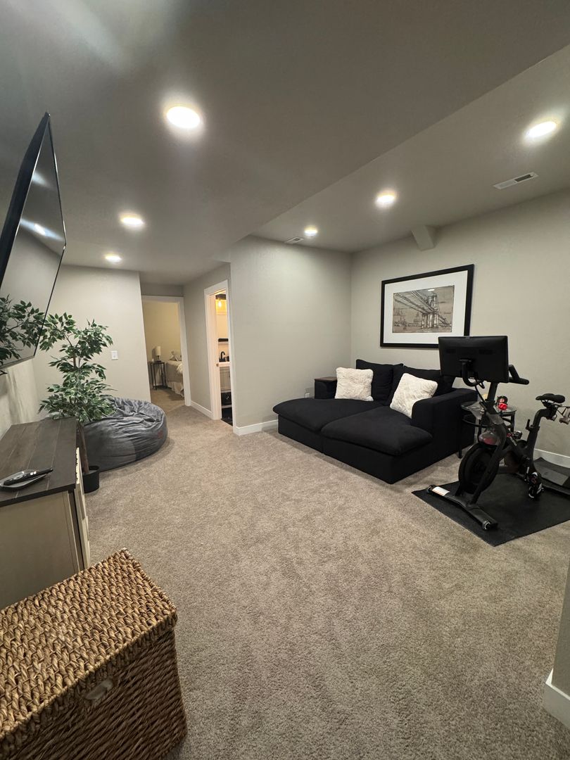 Downstairs, the finished basement is the ultimate bonus space—big TV, and a comfy couch.